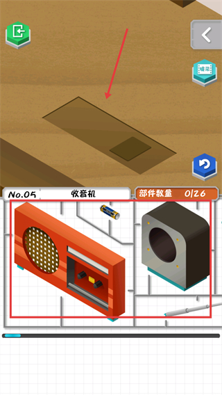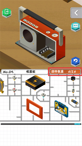 2、进入【No.05-收音机】关卡,将红框内的部件(机身、喇叭等)按轮廓拼接,逐步完成模型组装。