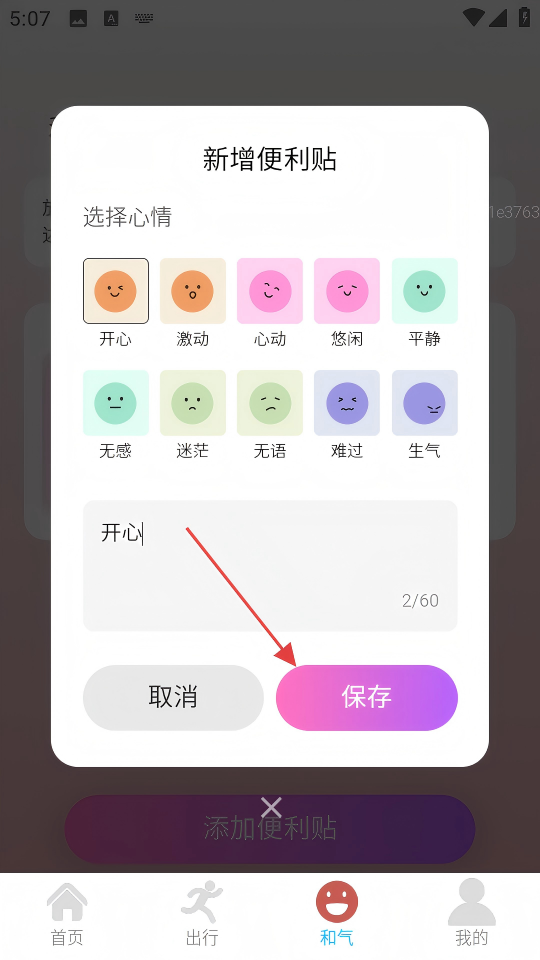 3、在新增便利贴窗口,选择心情(如“开心”),并输入想表达的内容。