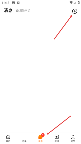 1、进入【消息】页面,点击右上角加号按钮,展开功能选项菜单。
