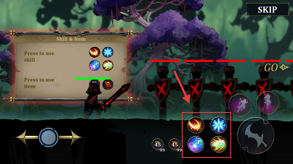 4、点击技能与物品按钮,使用对应的技能和道具,辅助战斗来推进关卡。