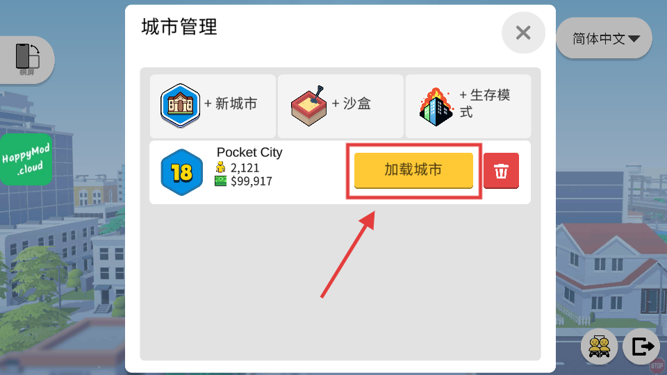 1、点击【加载城市】按钮,进入【PocketCity】(等级【18】、人口【2,121】、金钱【$99,917】)继续经营。