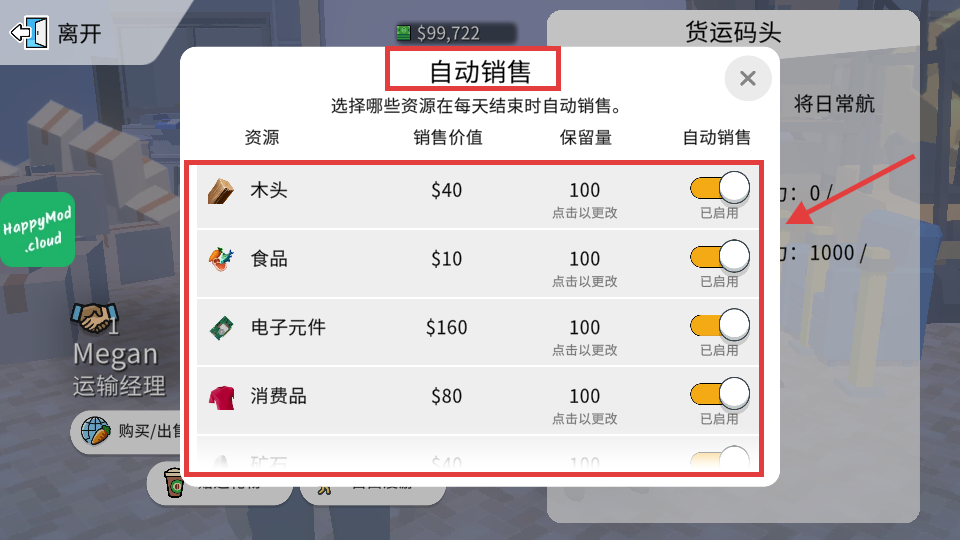 2、在【自动销售】界面,设置【木头】【食品】等资源自动销售,点击保留量可更改以优化收益。