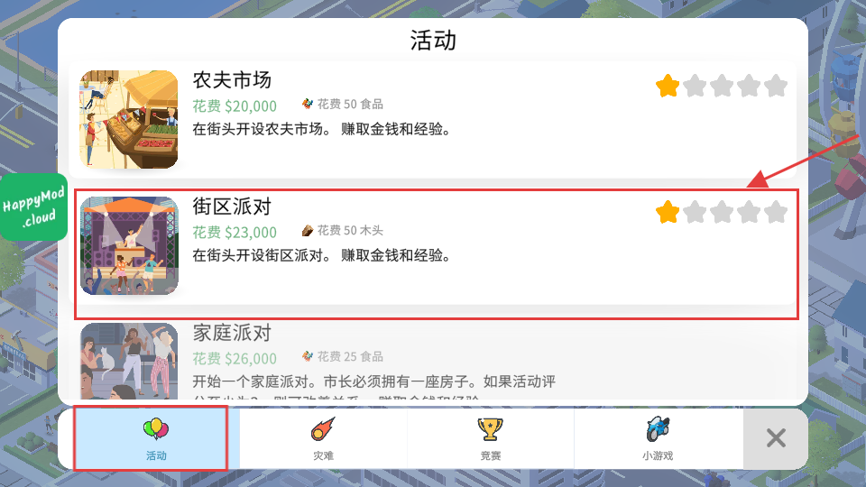 3、在【活动】中,花【$23,000】和【50】木头开展【街区派对】,赚取金钱与经验。