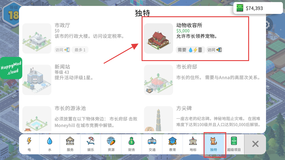 4、在【独特】栏,花【$5,000】建【动物收容所】,满足水电条件后可领养宠物,丰富城市。