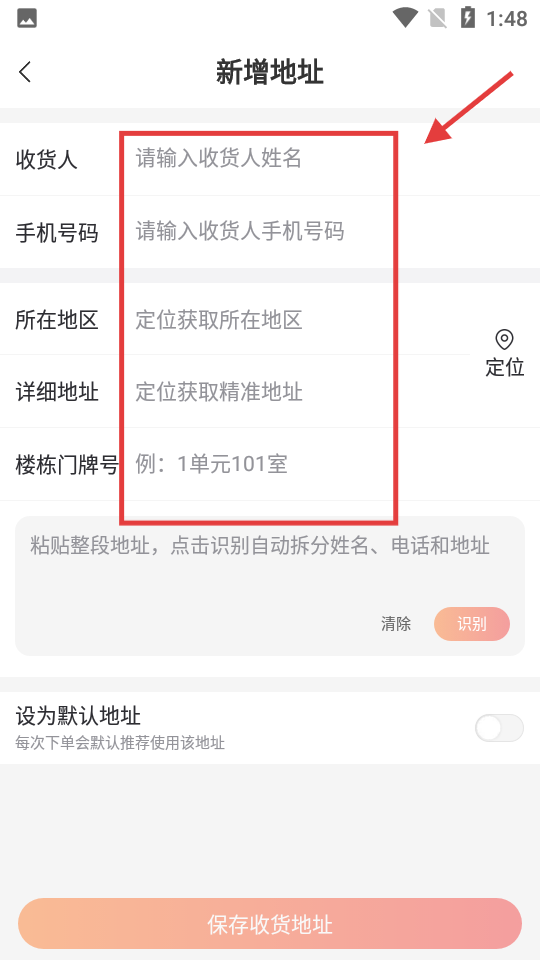 4、填写【收货人】【手机号码】【所在地区】等信息,填写完成后点击【保存收货地址】。