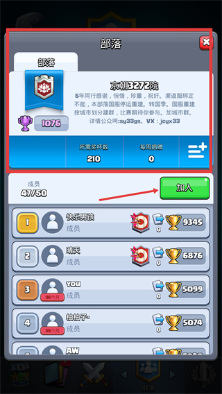 3、选择目标部落后进入详情页,确认【所需奖杯数】和部落信息,点击右侧绿色【加入】按钮,即可提交加入申请等待通过。