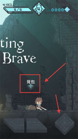 1、点击【背包】可查看或使用道具,提升角色能力,手持双剑的勇者借此强化,为遗迹闯关做好准备。