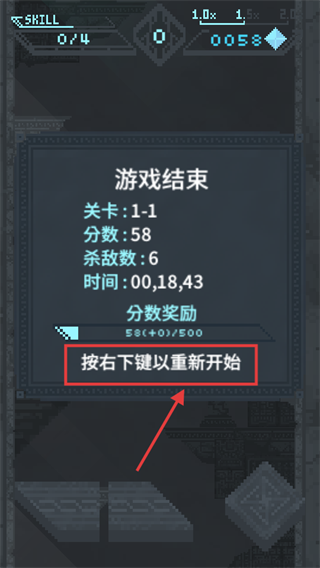 4、游戏结束后,按【右下方】键重新开始,积累战斗经验,优化技能策略,再次挑战【1-1】关卡,争取通关。
