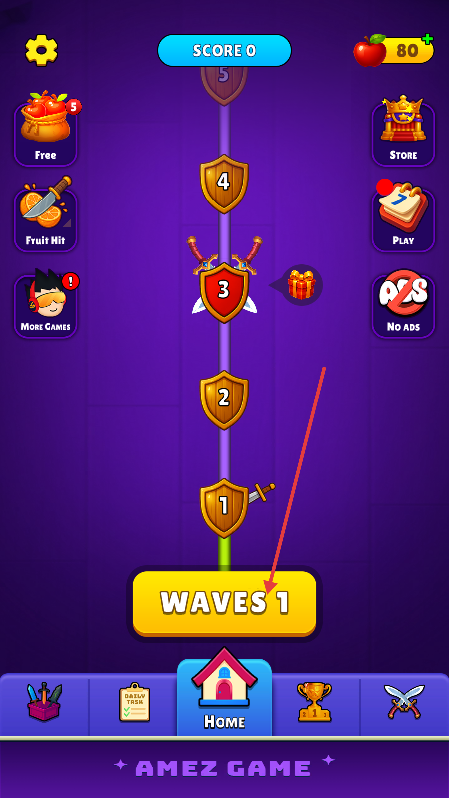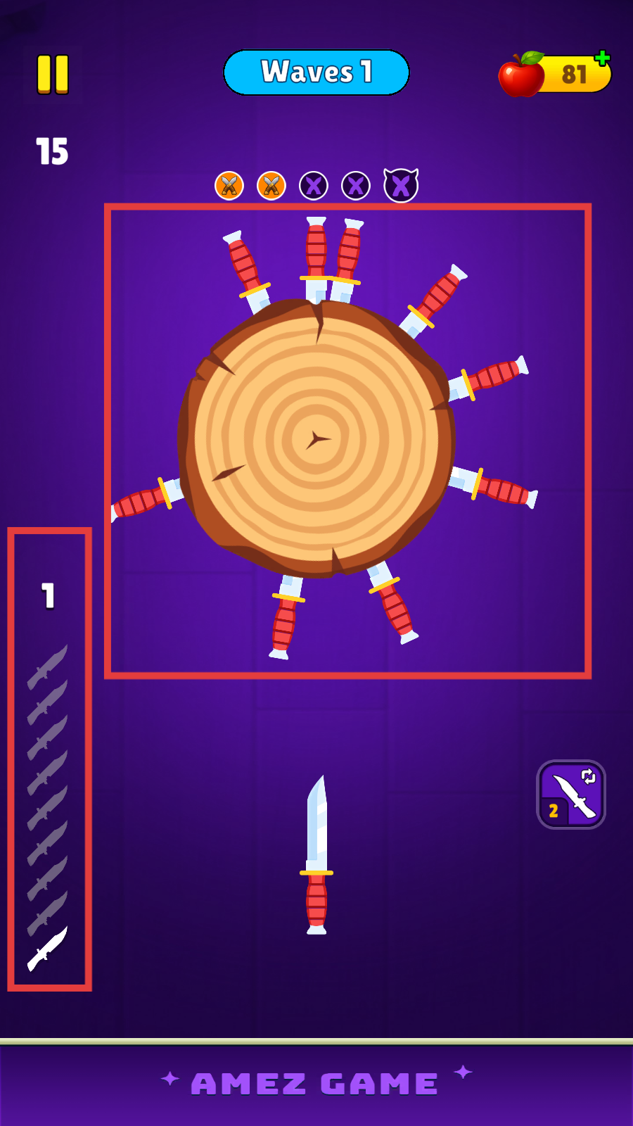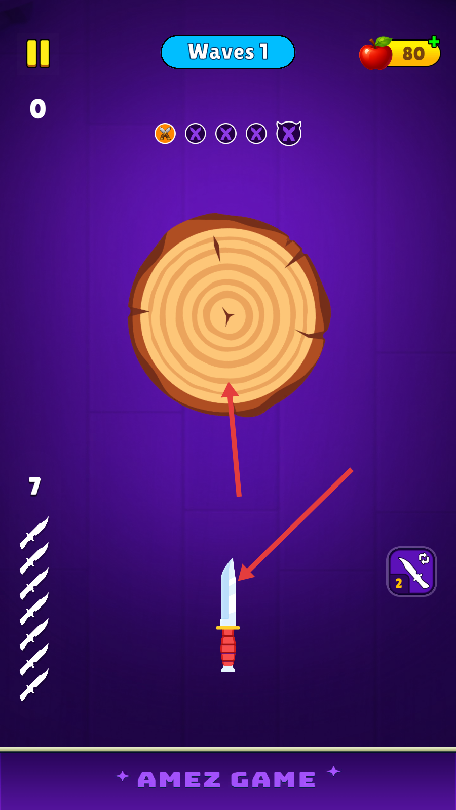 3、在【Waves1】中,将多把刀投掷到木头上且不碰撞。