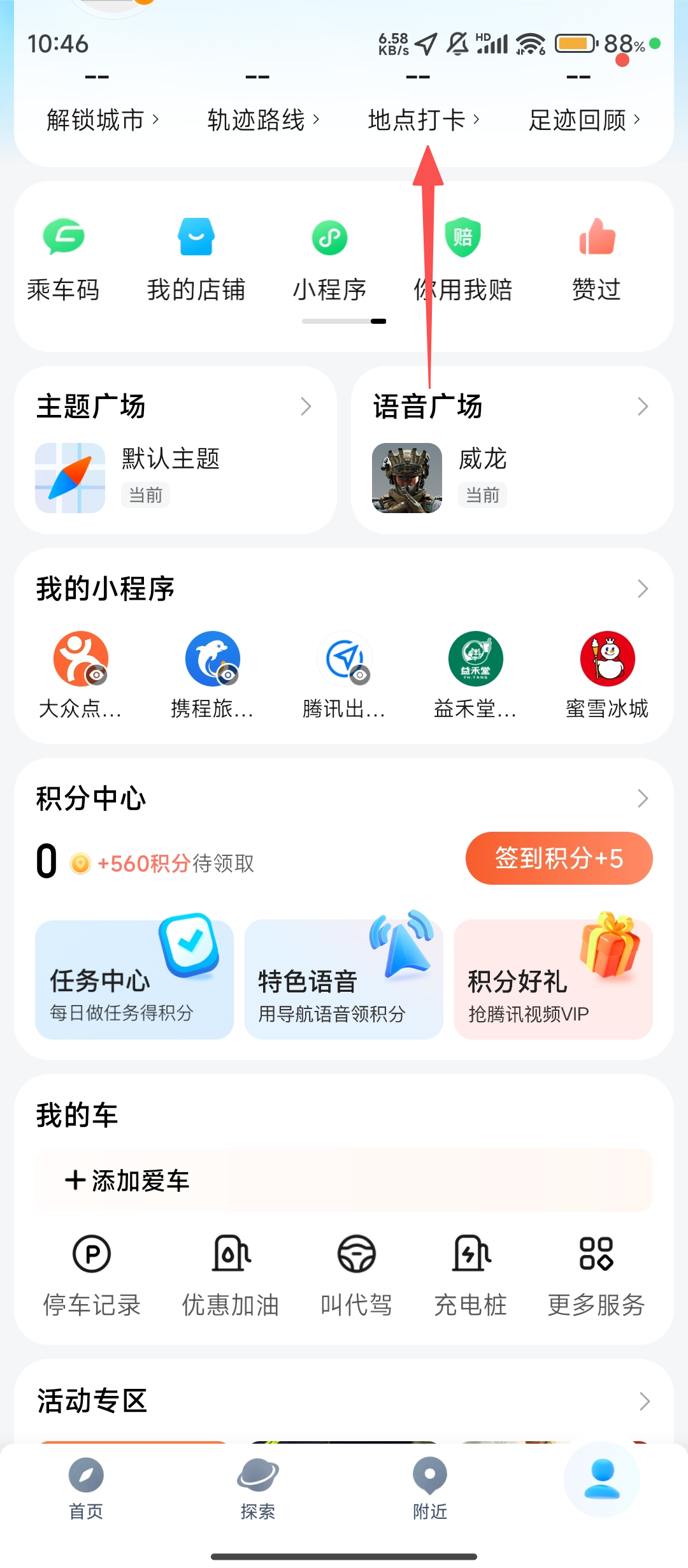 1、打开腾讯地图个人页面,找到【地点打卡】入口,点击进入就能开启打卡之旅啦。