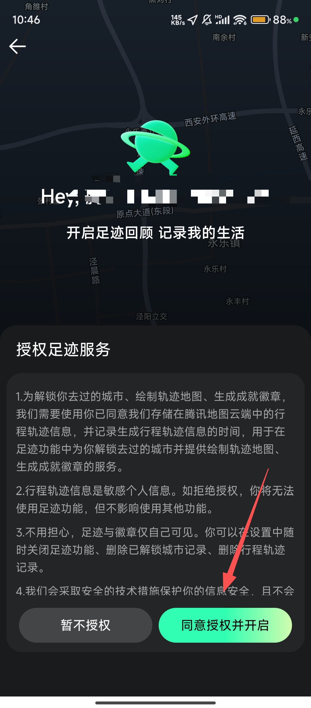 2、想要使用足迹功能,在授权足迹服务界面点击【同意授权并开启】,就能解锁城市、绘制轨迹地图等服务哦。