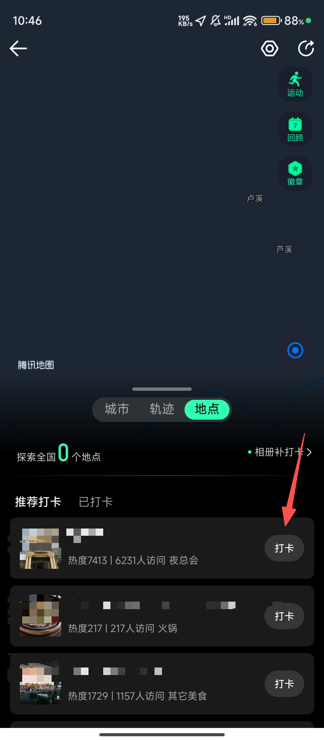 3、进入地点打卡界面后,看到推荐的打卡地点,点击右侧【打卡】按钮,就能记录我们的打卡足迹啦。