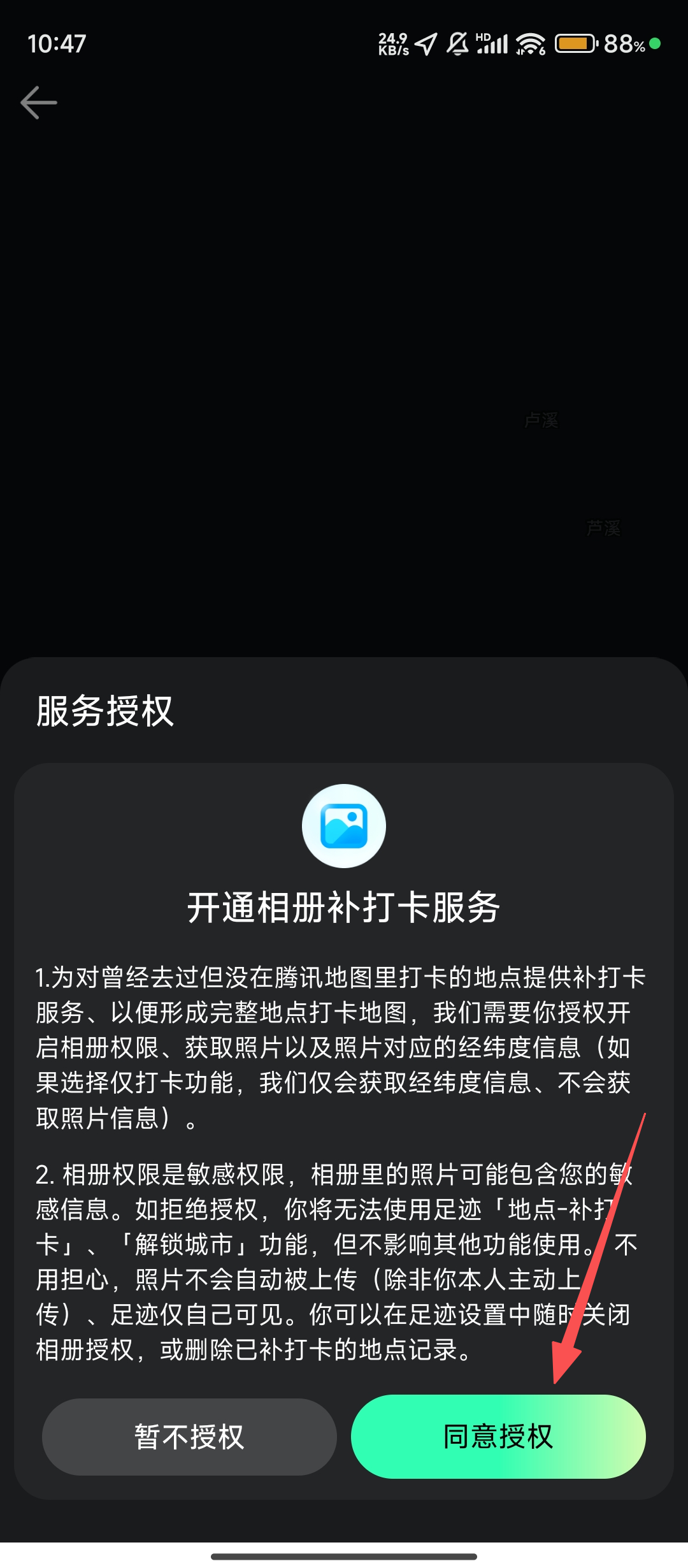 4、开通相册补打卡服务时,在服务授权界面点击【同意授权】,就能开启相册补打卡功能,方便补录去过的地点哦。