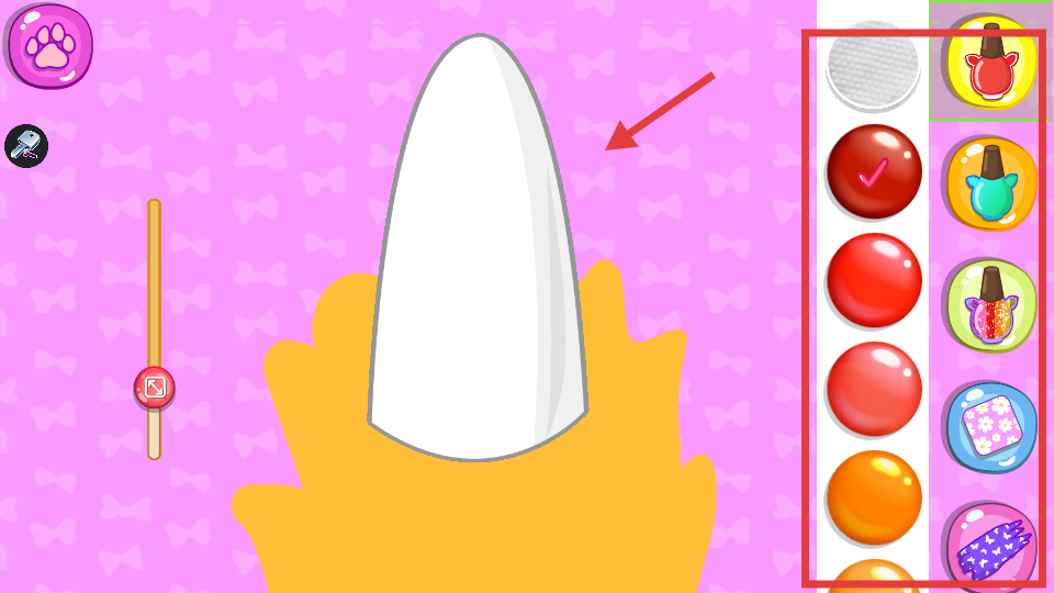 3、进入美甲界面,右侧有多种颜色的指甲油等工具,选择喜欢的颜色,为指甲进行装饰。