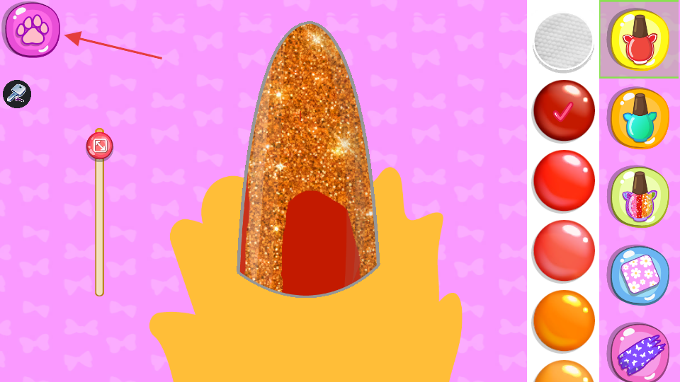 4、完成指甲装饰后,点击左上角粉色爪印按钮,可切换其他指甲。