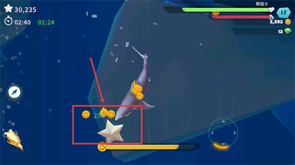2、控制鲨鱼收集场景中的【星星】-【金币】,积累资源可提升能力并解锁更多游戏内容。