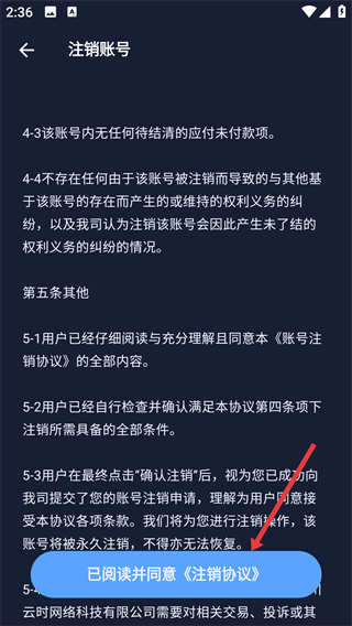 4、阅读《账号注销协议》内容后,点击“已阅读并同意《注销协议》”按钮,推进注销流程。