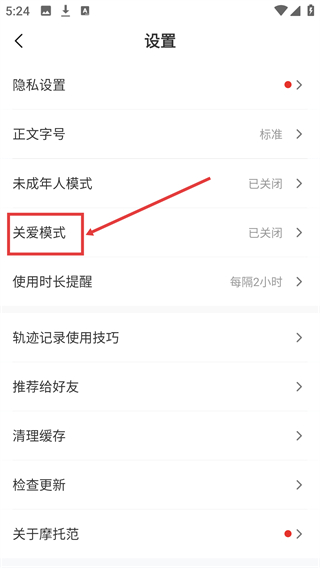 3、在【设置】页面,选择【关爱模式】选项并点击,进入关爱模式的功能说明界面。