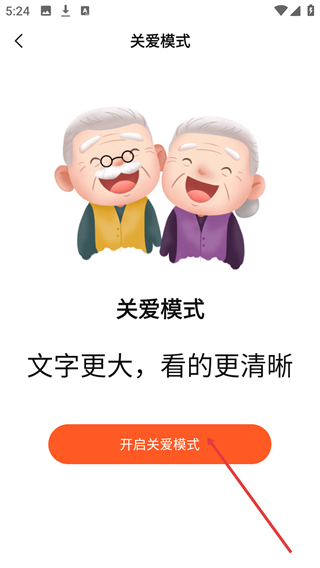 4、在【关爱模式】页面,点击【开启关爱模式】按钮,即可启用该模式让软件文字显示更大更清晰。