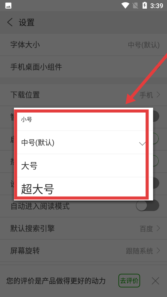 4、在弹出的字体大小选择框中,可选择【小号】【中号(默认)】【大号】【超大号】,根据需求选择即可完成设置。