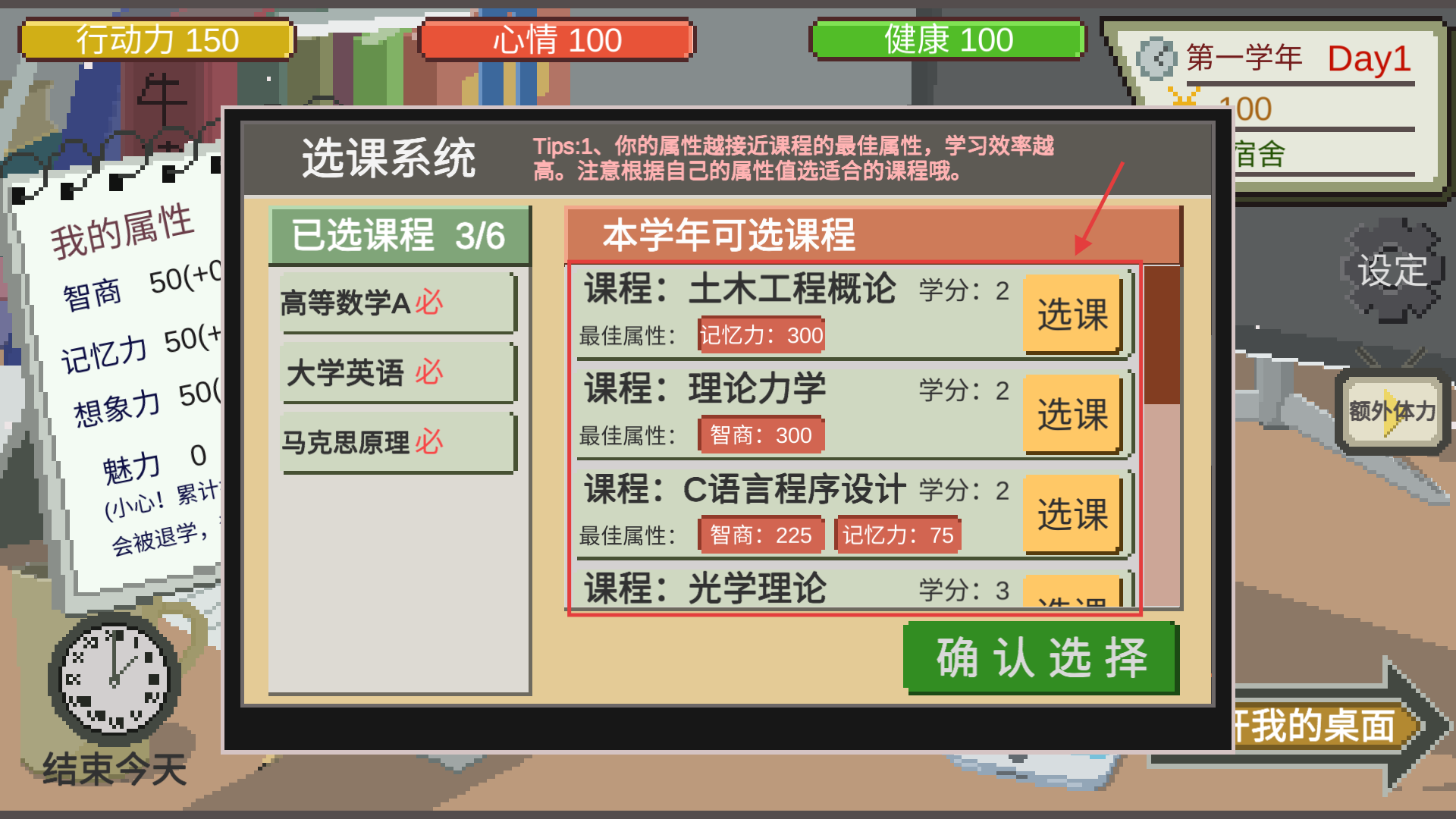 4、选课界面选【土木工程概论-学分2-记忆力300】等课,匹配属性提升效率,点击【确认选择】完成。