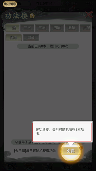 1、进入【功法楼】每月可免费获取1本随机功法,这是积累宗门功法资源的核心步骤,需按时操作提升储备。