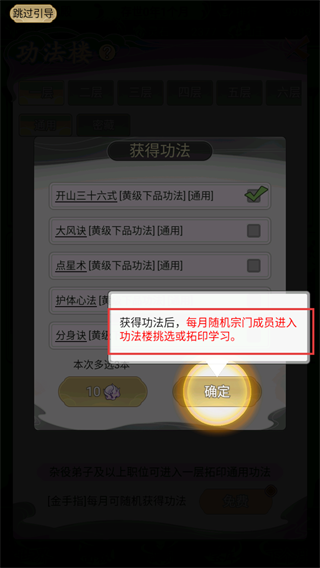 2、获得功法后每月安排宗门成员进入【功法楼】挑选或拓印,能有效提升弟子的功法掌握度与实力。
