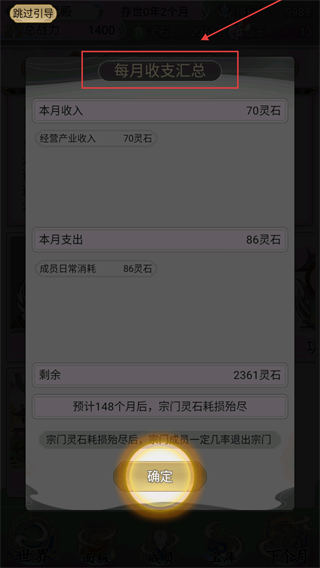 3、关注【每月收支汇总】平衡经营产业收入与成员消耗,避免灵石耗尽导致弟子退宗影响宗门稳定。
