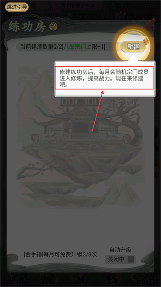 4、修建【练功房】后每月随机成员会进入修炼,这是提升宗门战力的重要途径建议尽早建造使用。