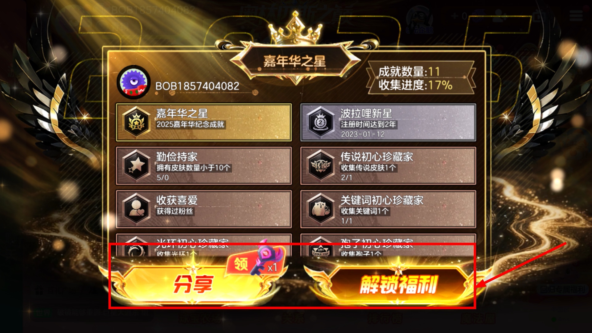 3、查看【嘉年华之星】成就进度,点击分享按钮拿奖励,再解锁福利提升游戏体验与收集进度。