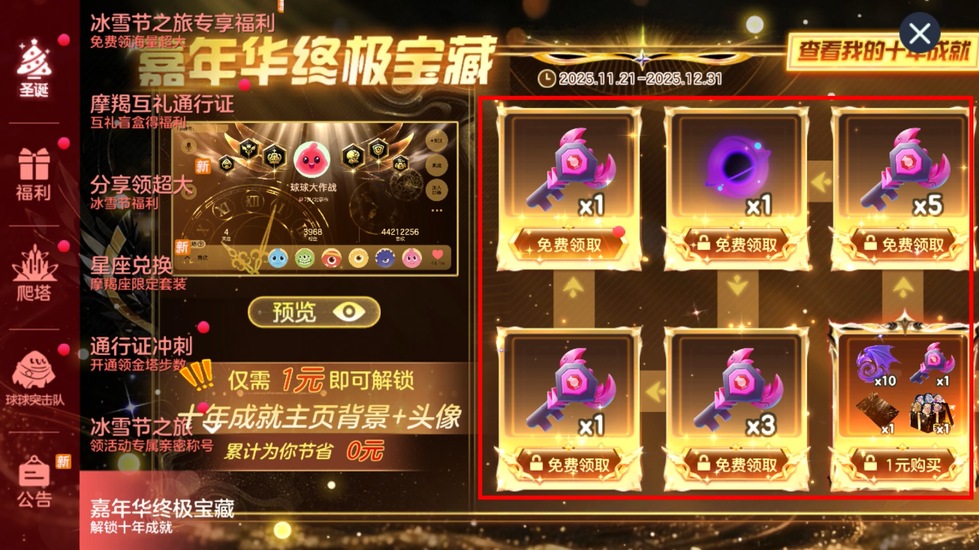 4、在嘉年华终极宝藏界面,免费领【钥匙】等道具,积累后解锁更多限定奖励与福利内容。