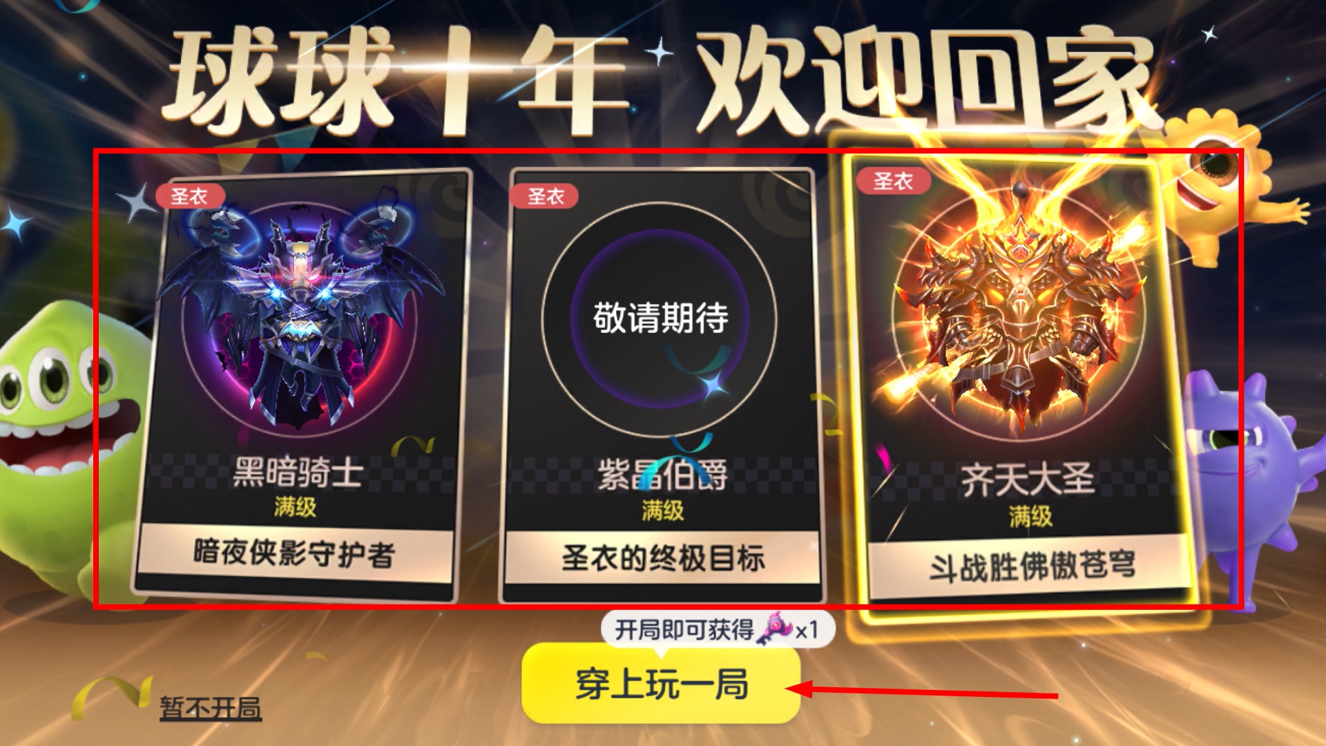 1、选择【齐天大圣】-【黑暗骑士】-【紫晶伯爵】中的满级圣衣,点击穿上玩一局按钮开启游戏对局。