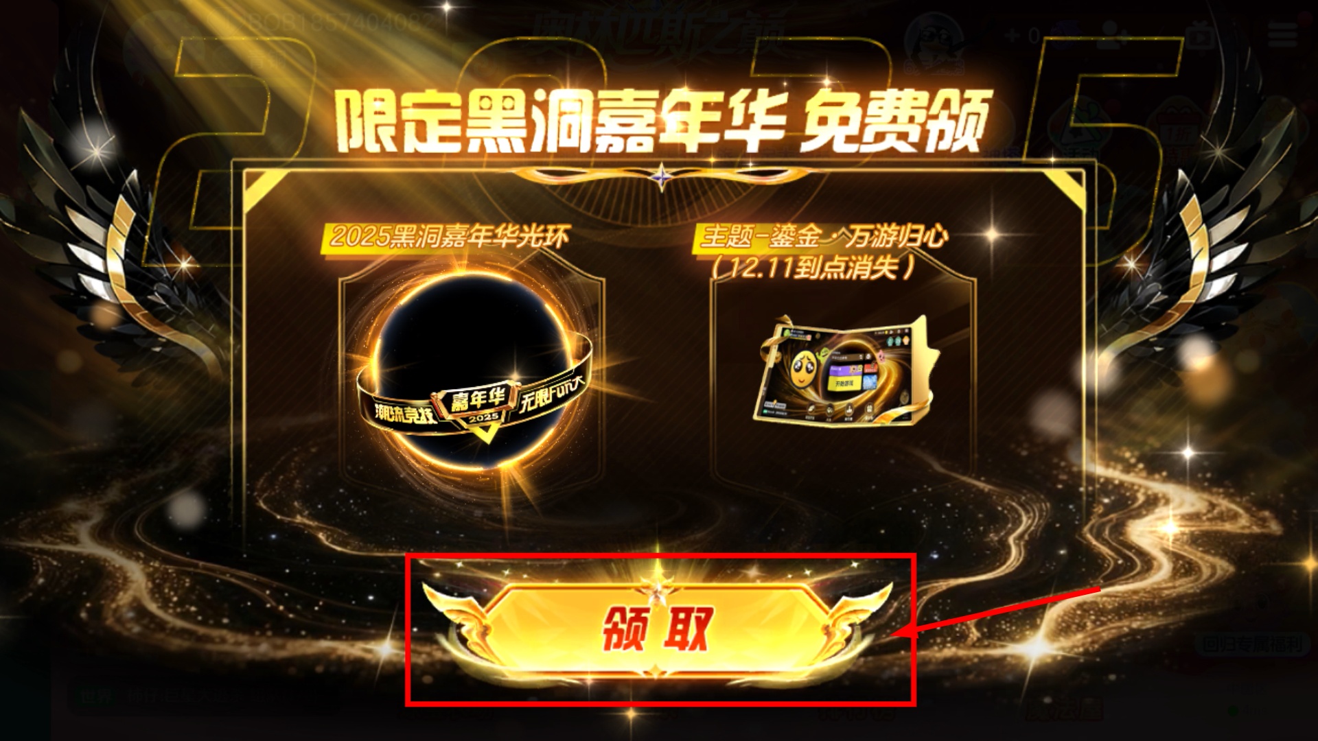 2、在限定黑洞嘉年华界面,点击领取按钮获取【2025黑洞嘉年华光环】与主题外观,增强角色视觉效果。