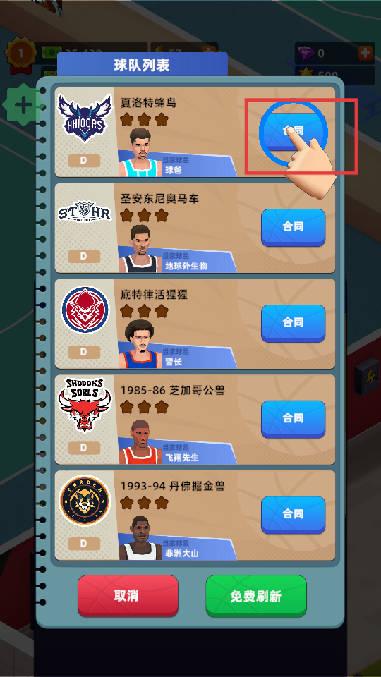 4、在球队列表中点击【合同】,签约球队,增强篮球馆实力。