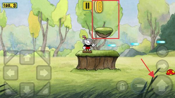 2、操控角色跳上树桩平台,点击右侧跳跃按键,向高处悬浮平台移动,尝试获取上方道具。