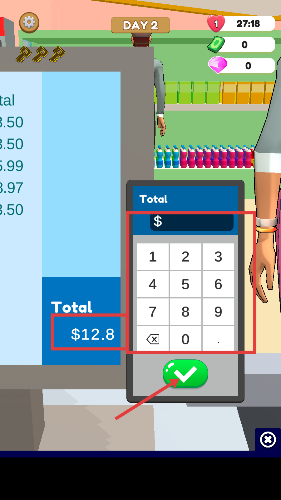 4、在计算器上确认总价【$12.8】,点击绿色对勾完成结算。