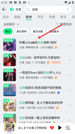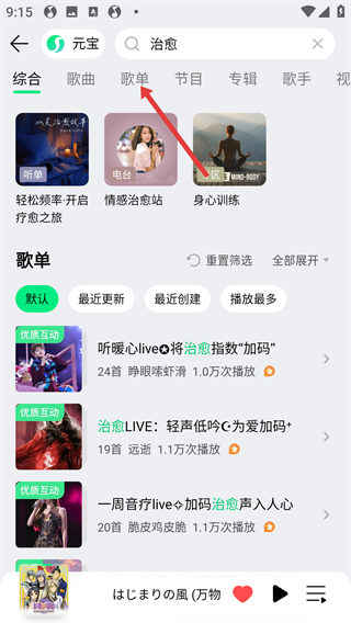 2、在搜索结果页,点击【歌单】标签切换分类呀。