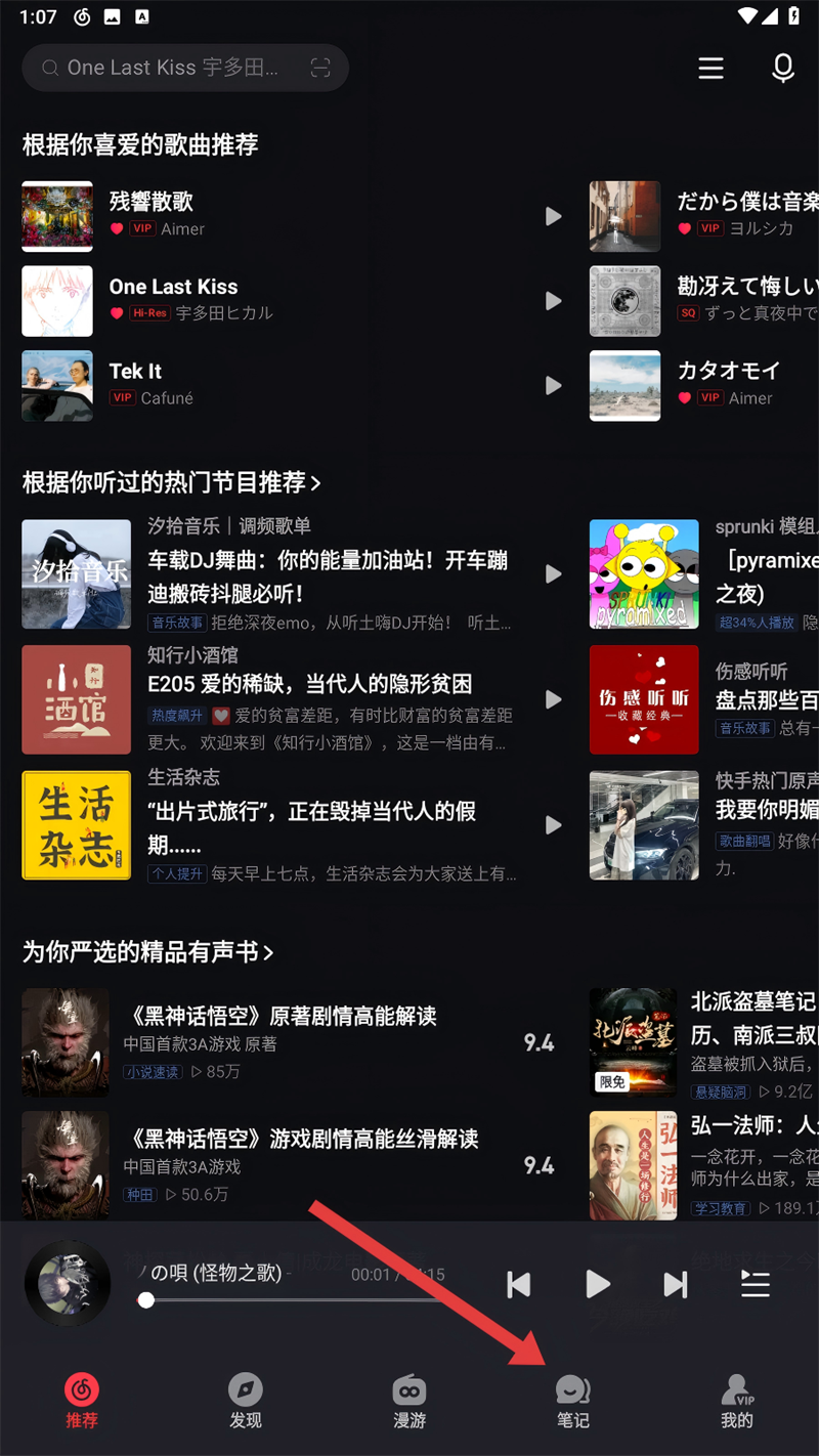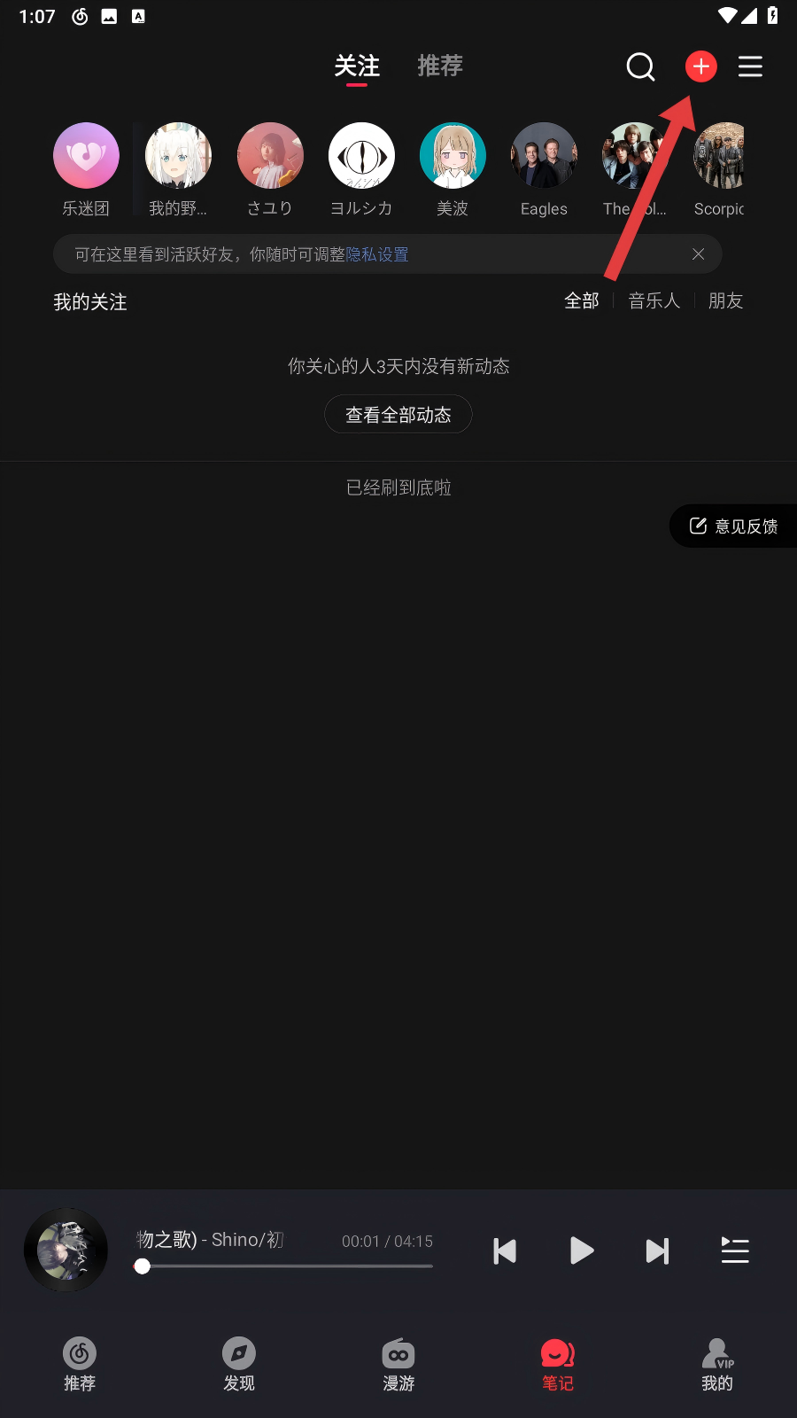 1、我们打开网易云音乐,点击底部导航栏的【笔记】,进入笔记页面开始创作呀。