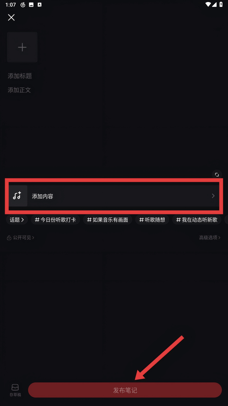 4、接着我们还能点击【添加内容】选择音乐,都设置好后,点击底部【发布笔记】,就能分享啦。