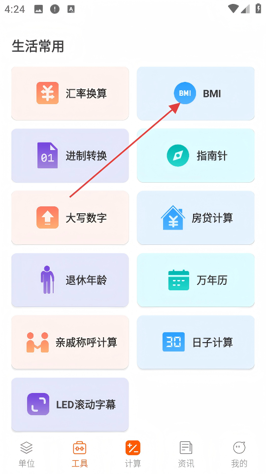 2、在工具页面的生活常用功能中,选择【BMI】,进入BMI计算页面。