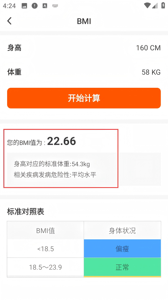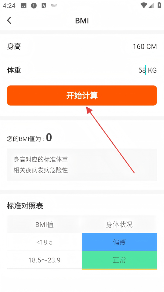 3、在BMI计算页面,输入身高和体重,点击【开始计算】按钮。