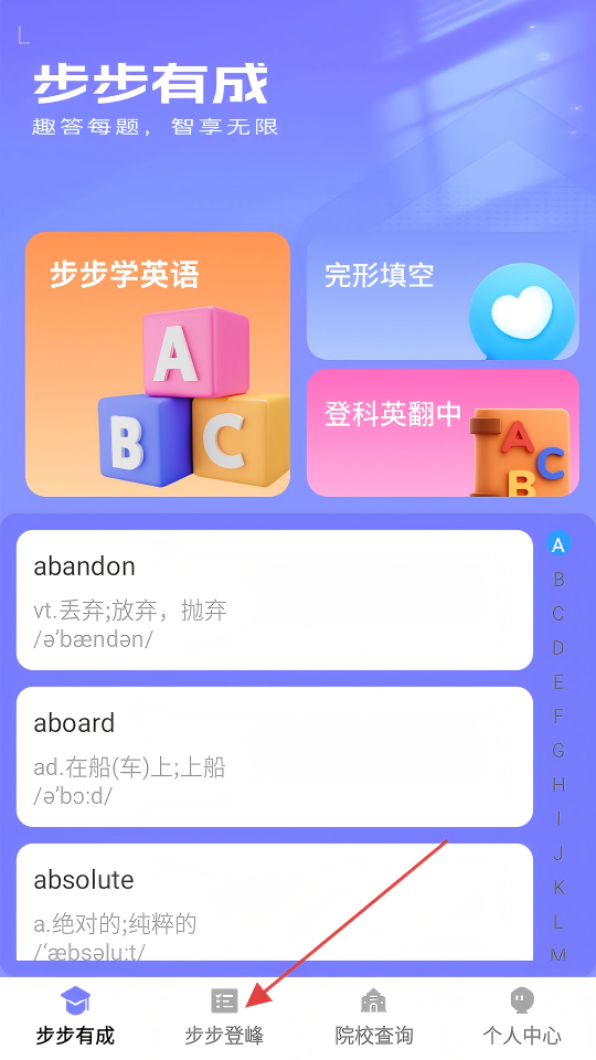 1、在“步步有成”首页,点击底部【步步登峰】,进入对应页面。