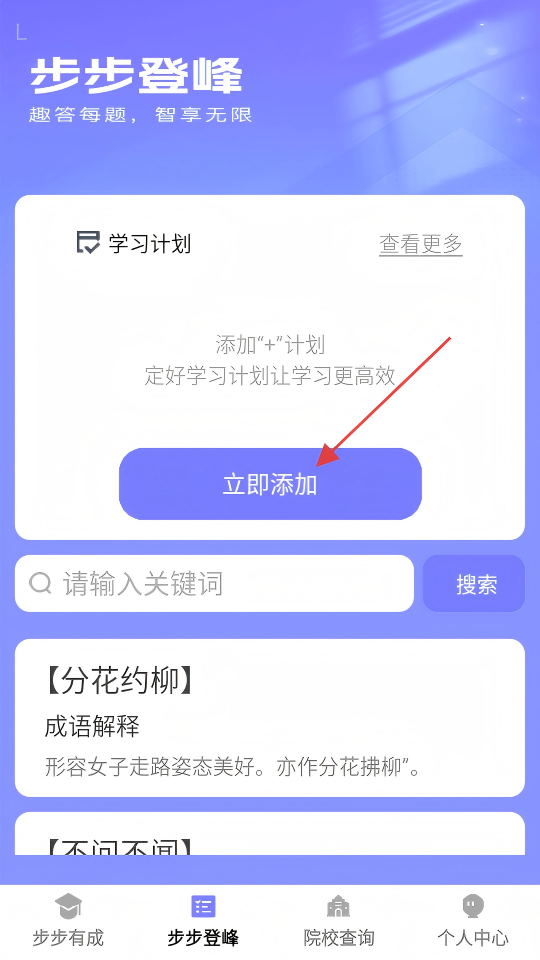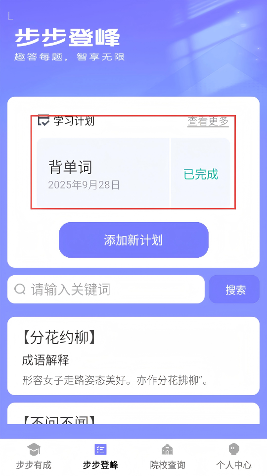 步步有成是一款专注为用户提供英语知识学习的工具,还整合大学院校查询功能,助力用户兼顾英语提升与院校了解。它涵盖四级词汇、完形填空等英语学习内容,用户可一键开启学习积累词汇,同时能依据自身情况制定科学学习计划,详细编辑学习安排;此外支持查询国内大学院校信息与排名,搭配英语答题、成语学习等辅助功能,让用户在提升英语能力的同时,实现高效学习与院校认知的双重需求。