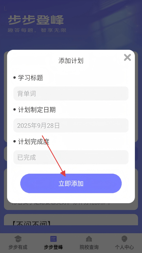 3、在窗口中设置学习标题、日期、完成度等,再点【立即添加】。