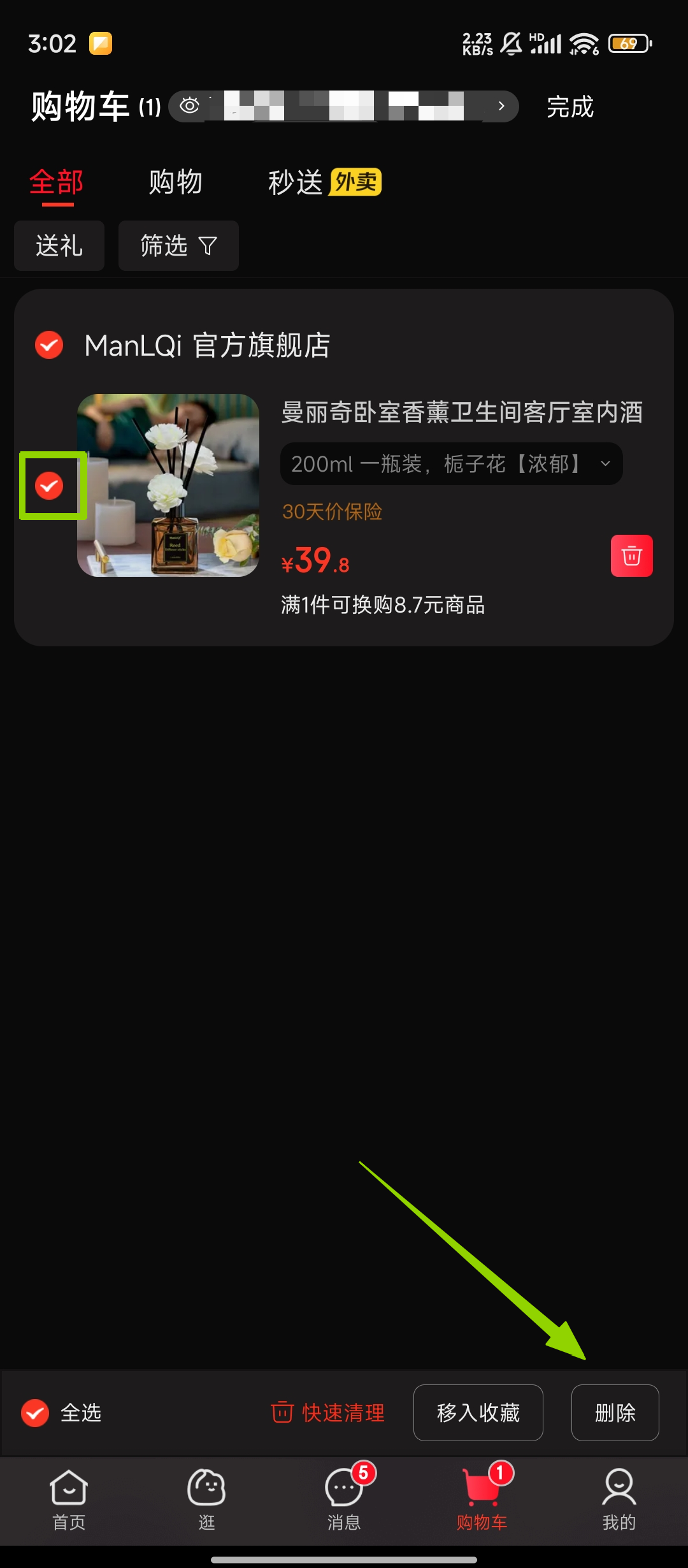 3、进入管理模式后,勾选要删除的商品,再点击底部【删除】按钮,就可准备移除商品啦。