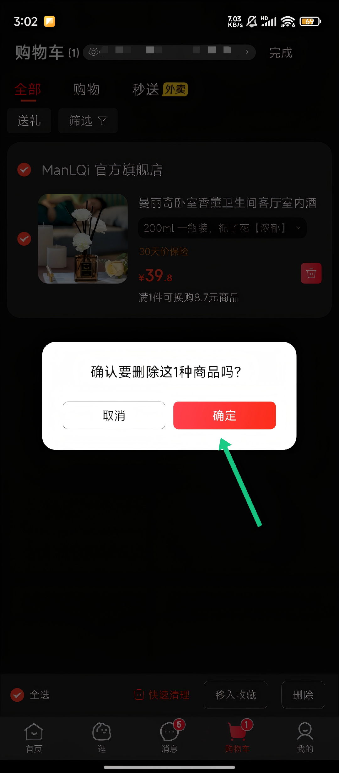 4、点击【删除】后,弹出确认框,选择【确定】,就能把选中的商品从购物车删掉啦。