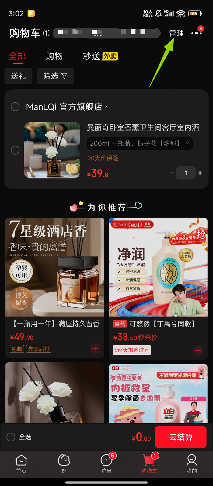 2、在购物车页面,找到右上角【管理】按钮并点击,便能进入商品管理模式哟。