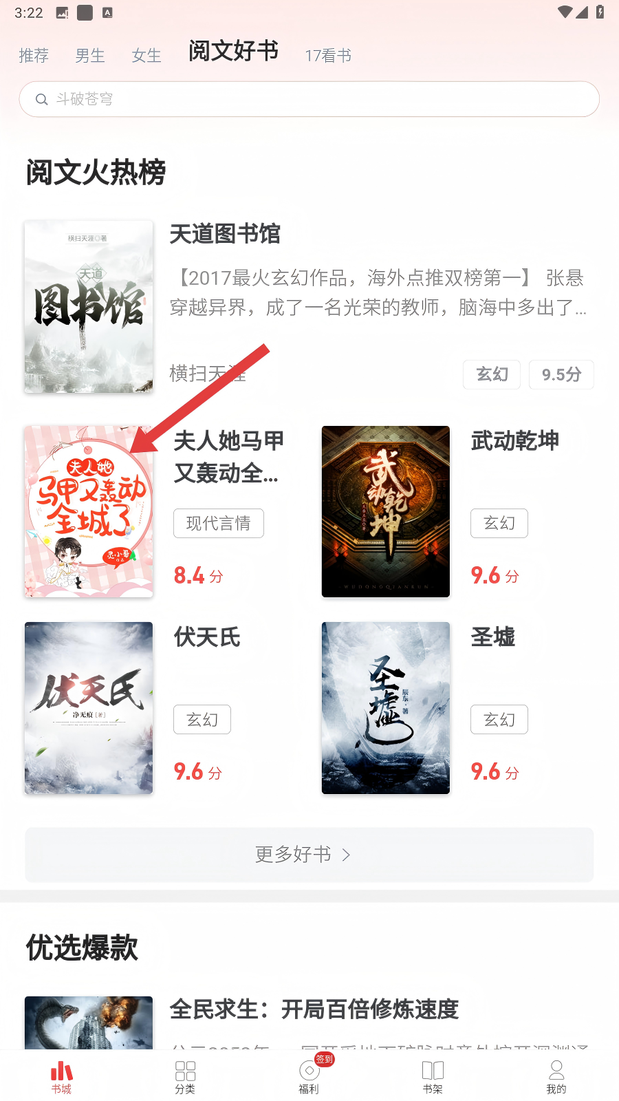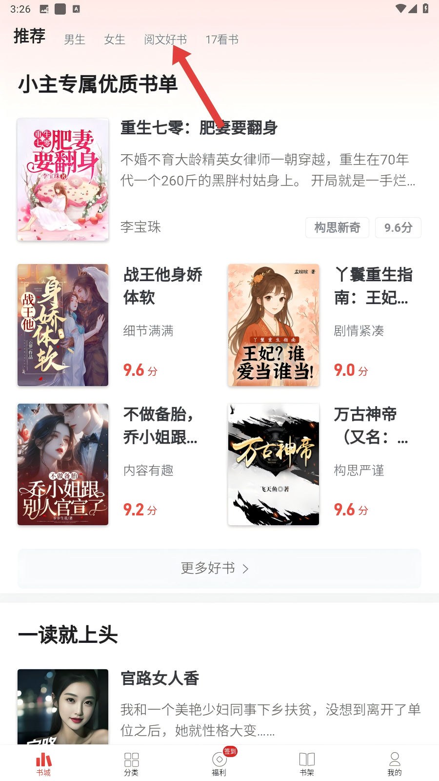 1、进入【书城】的【阅文好书】板块,准备选择想看的小说啦。