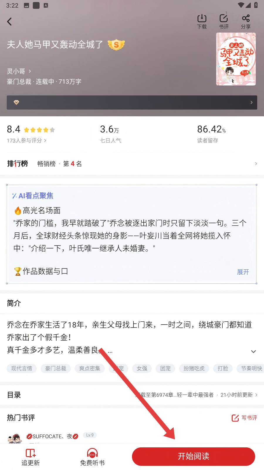 3、在小说详情页,找到底部红色的【开始阅读】按钮,点击开启阅读之旅哦。