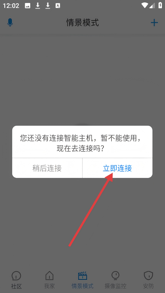 2、看到弹窗提示【您还没有连接智能主机,暂不能使用,现在去连接吗?】,点击【立即连接】按钮。